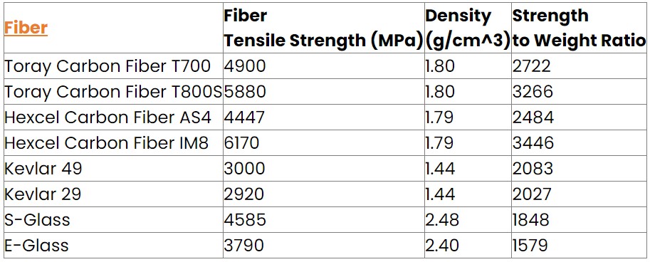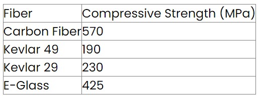 拉伸強度是材料在拉伸時承受載荷的能力。它是纖維發(fā)生永久變形之前所施加的最大力或載荷。如圖所示,碳纖維在強度和重量方面總體上優(yōu)越。然而,S-Glass 和 E-Glass 之間存在顯著差異。就密度而言,凱夫拉纖維是最輕的材料。雖然凱夫拉纖維的極限強度最低,但就強度重量比而言,它超過了玻璃纖維,與碳纖維相當(dāng)。從經(jīng)濟角度來說,如果極限強度是唯一的設(shè)計標(biāo)準,那么無堿玻璃是最佳選擇。